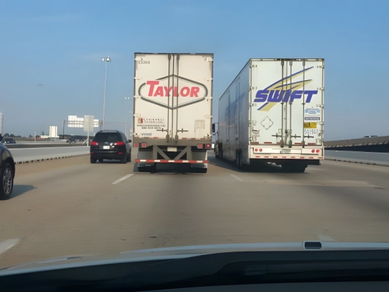 While driving, this person saw two trucks aligned to spell "Taylor Swift." It's not the singer herself, but the names of two trucking firms. Did the drivers notice and keep the formation for fun? It's a quirky roadside moment.
