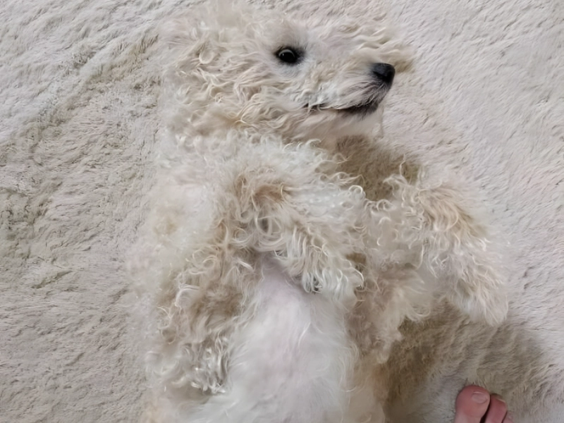 This fluffy white dog blends seamlessly with the rug beneath it. The rug was a gift, and the owner quickly saw its striking similarity to their pet. Without the dog's black nose and eyes, spotting him would be tough. Hopefully, no one steps on him by mistake!