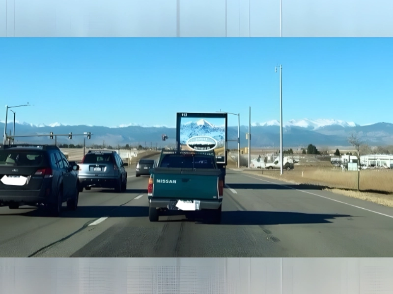 A truck bearing a Rocky Mountains image aligned perfectly with the actual peaks behind it. The snowy tops even sync up. Without the truck's border, distinguishing the photo from reality would be tricky.