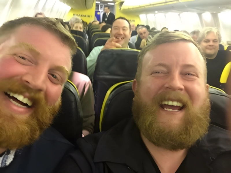 On a flight, a man noticed his seatmate looked almost identical to him. A friend behind them snapped a photo and couldn't stop chuckling. With matching beards and hair, only slight eyebrow differences set them apart. They could pass as twins.
